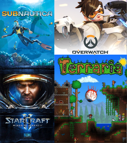 I like Factorio, Overwatch, Subnautica, Terraria, and Starcraft II, among others.